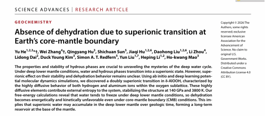 地球深部水循环过程是认知地球演化和宜居性形成的关键。传统观点认为,俯冲板块携带的水在进入深部地幔过程中会因高温而逐步脱水释放。然而,地球最深处的水究竟以何种形态存在、是否仍会发生脱水反应,一直缺乏明确认识。研究团队通过第一性原理分子动力学与深度学习势分子动力学模拟,系统研究了地球下地幔尤其是核幔边界条件下含水矿物与水的热力学稳定性。研究发现,在极端高压高温条件下,水及关键含水矿物δ-AlOOH会进入一种特殊的超离子态,从而显著抑制脱水过程。