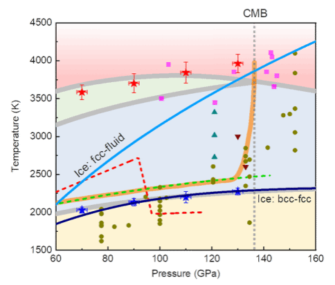 图1:AlOOH和H2O高温高压下(60-160 GPa与1500-4500 K)相图,超离子态转变增加了含水相的稳定性,使得AlOOH和H2O在下地幔(橙色为地温曲线)以超离子态形式存在。